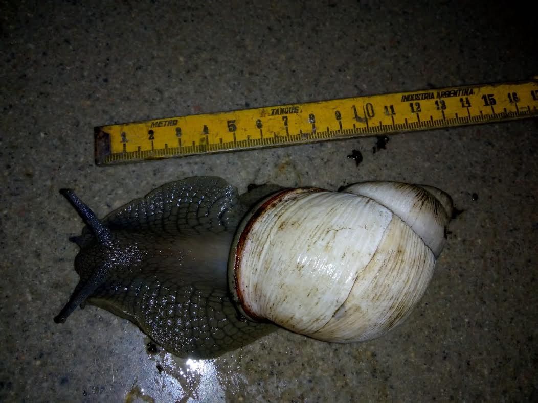 El hallazgo lo hizo la vecina Silvia Martín, de Mensajería Maisonnave, quien lo vio en la puerta de su casa en el barrio Moreno. Nos decía Silvia que piensa conservarlo en su casa como una mascota, rara por cierto en estos lares. Come como un león las verduritas que Silvia le da, trepándose a sus brazos con total mansedumbre. Digamos que es un gigante de la familia de los caracoles.