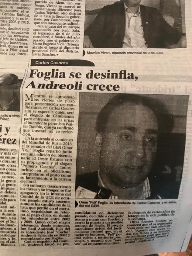 En dichos escritos se hace mención incluso a un fixture que fue repartido en una edición de El Oeste en ocasión del Mundial Rusia 2018, en el cual con la foto del exsenador Foglia aparecía el slogan «Primero Casares» en inequívoca intención de mostrarlo a Foglia como futuro candidato a intendente casarense.  El medio que llegó a nuestra manos, La Voz de Bragado, manifiesta que la imagen de Foglia se fue apagando, lo ubica lejos del radicalismo y señala el respaldo obtenido por el joven dirigente Raúl Andreoli, recientemente electo titular de la UCR local, a quien le aseguran el respaldo del comité «decidido a competir mano a mano con Torchio y cerrar la puerta a un posible retorno de Foglia», dice el medio colega.