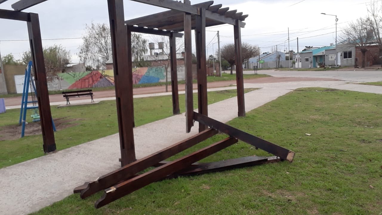 Al comenzar la mañana (jueves) nos encontramos con una pérgola de las veredas internas del lugar casi rota en su totalidad. No es la primera vez que pasa, sufrimos en éste espacio de recreación múltiples actos de salvajismo como la ruptura de juegos, de las luminarias y lo mas doloroso; el robo del cartel « PLAZA DE LA MEMORIA», una frase tan significativa para la historia de nuestro país.