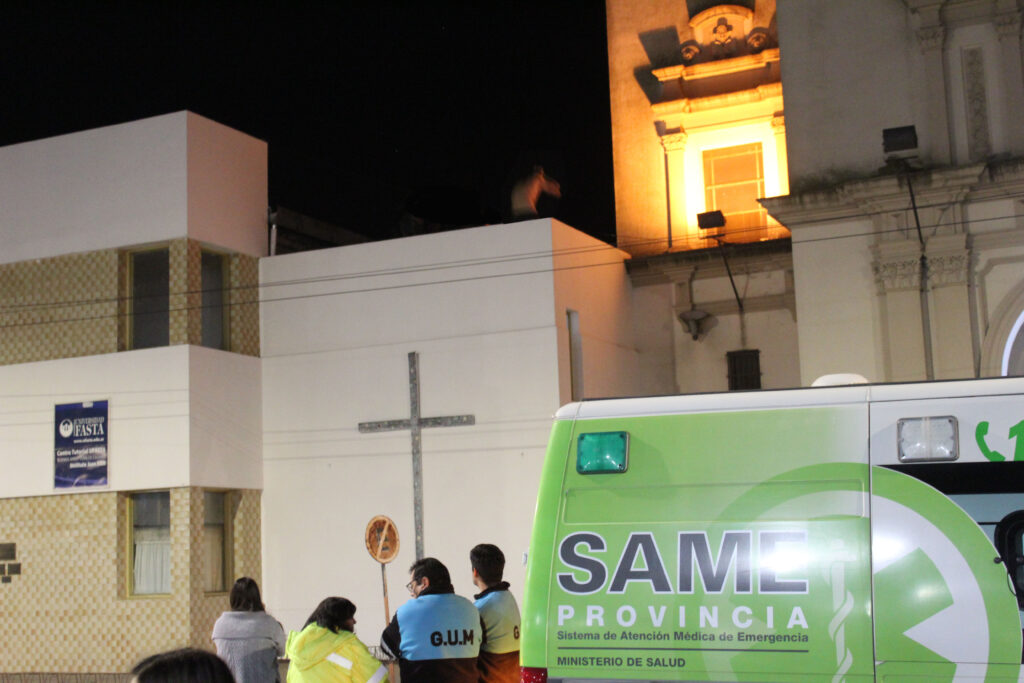 El joven estaba en un estado muy alterado y repetía “no me tiren, no tengo nada”, poco a poco se fue pasando desde la Cruz que se encuentra en el techo de la iglesia arriba de la puerta de entrada hasta el techo del Instituto Juan XXIII, pegado a la iglesia, donde funciona la secretaría diciendo continuamente y con los brazos abierto “no tengo nada, no me disparen”.
