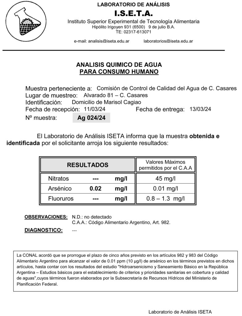 La muestra se tomó en el domicilio de la vecina Marisol Cagiao en Alvarado 81 y el laboratorio responsable del análisis I.S.E.T.A. de Nueve de Julio.